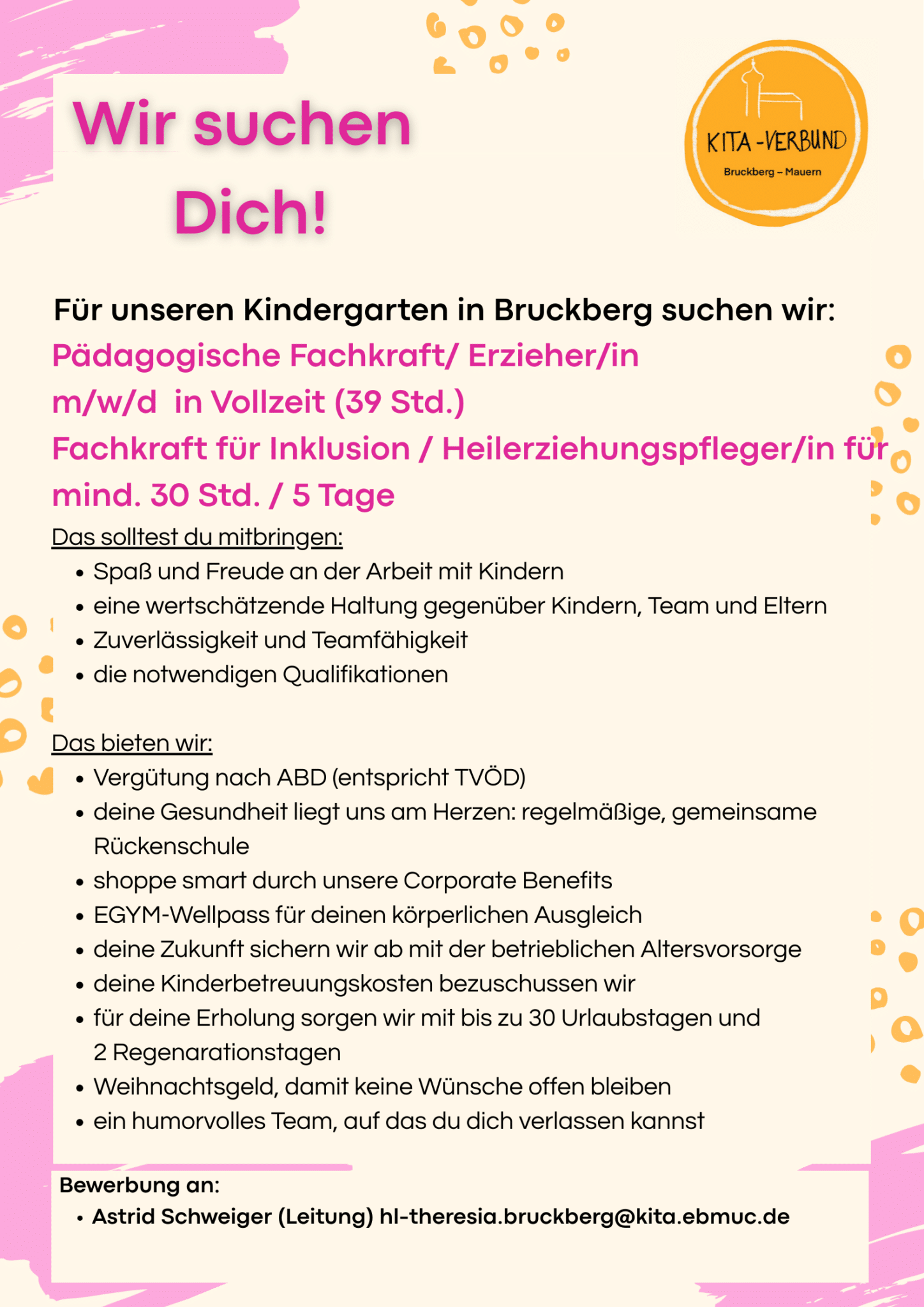 Sie sind hier: Startseite » Kindergarten Bruckberg sucht eine Pädagogische Fachkraft/ Erzieher/in m/w/d in Vollzeit und eine Fachkraft für Inklusion / Heilerziehungspfelger/in für mind- 30 Std. / 5 Tage